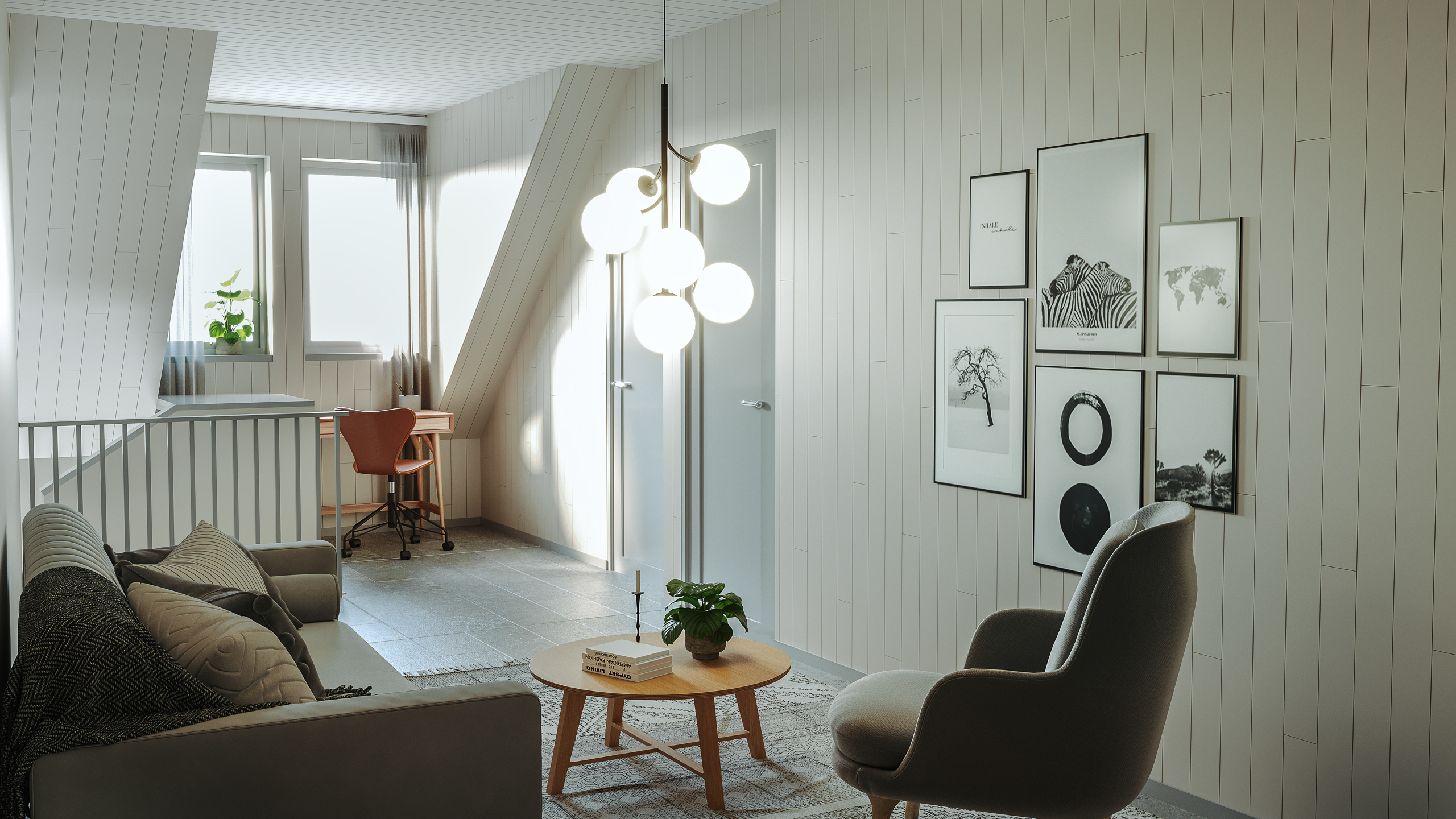 Utforska denna trevliga lägenhet, belägen i mitten av huset, med en smart och yteffektiv planlösning. Njut av en privat altan tillgänglig från det rymliga vardagsrummet. Den övre våningen pryds av takkupor som skapar ett magiskt ljusinsläpp i hallen och det generöst tilltagna sovrummet. Upplev en harmonisk kombination av praktiskt utnyttjande och exklusivt utrymme i denna unika bostad!